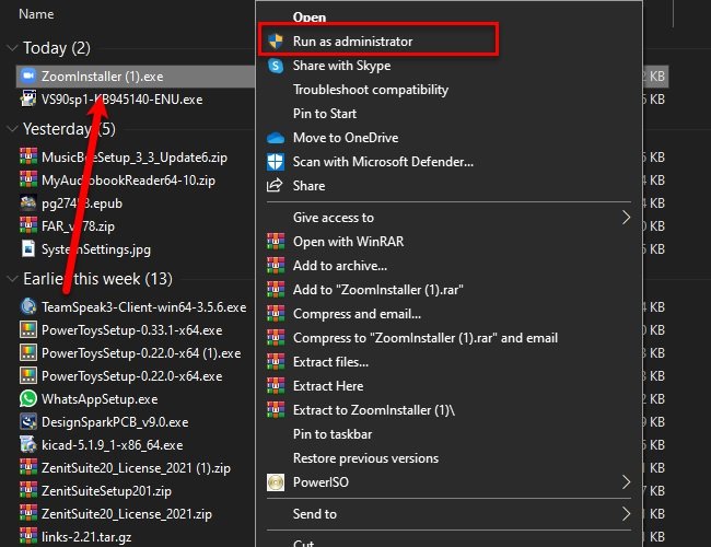 したがって、Zoom に適切な許可を与えるには、Web サイトからアプリケーションを手動でダウンロードし、ダウンロードしたファイルの場所に移動して右クリックします。ZoomInstaller.exeを選択し、管理者として実行。