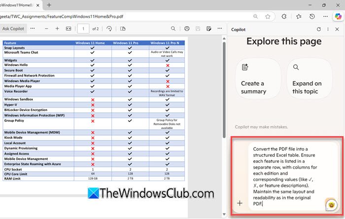 あなたはできるCopilot を使用して PDF を Excel に無料で変換する Microsoft Edgeで。 Copilot は、ブラウザ タブで現在開いているファイルまたはコンテンツを読み取って操作し、質問に答えたり、それに基づいた概要を提供したりできます。