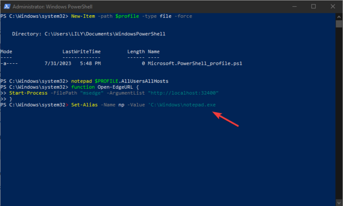 Linux と同様に、プロファイルにエイリアスを追加して、長いコマンドを実行しやすくすることもできます。私たちが使用するのは、エイリアスの設定Windows サーバー上のエイリアスをカスタマイズするコマンド。開きたい場合はメモ帳PowerShell から自動的かつ瞬時に、以下に示すようにエイリアスを追加できます。