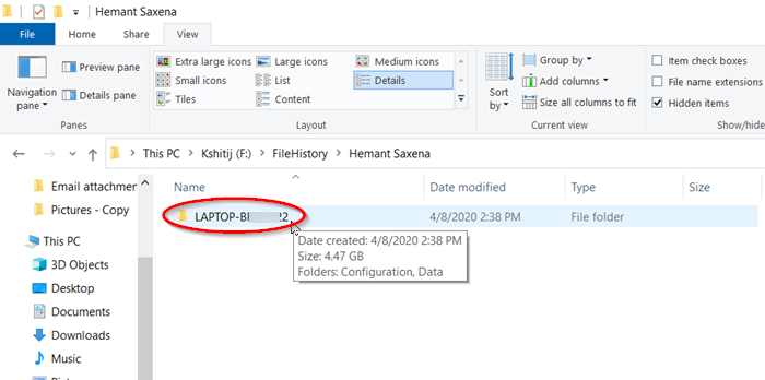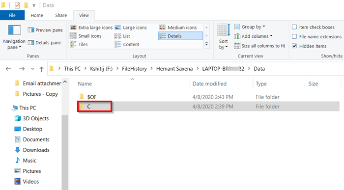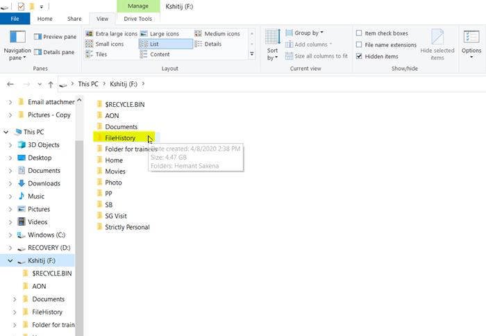 まず、ファイル エクスプローラーを起動します。次のことを確認してください。オプションが有効になっています。次に、ファイル履歴ファイルのあるストレージの場所 (SD カード/USB/外付けハードドライブ) に移動します。ダブルクリックして、ファイル履歴フォルダ。