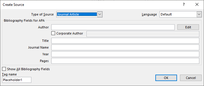 次に、研究論文の詳細を追加して参照を追加します。入力できますソースの種類(雑誌記事、書籍、会議録、ウェブサイト、電子ソースなど)、タイトル、著者、年、ページ、などなど。参照内容を指定したらOKボタンを押してください。