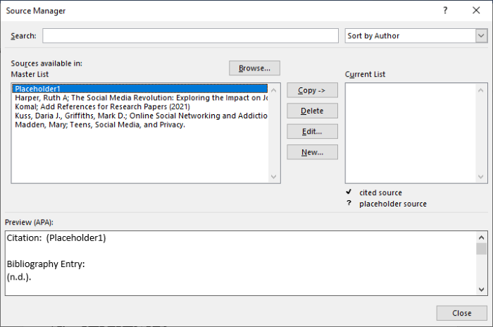 ドキュメントに追加したすべての参照とソースを管理できます。ソースの管理オプション。それはあなたを可能にしますコピー、編集、削除、そして検索必要なソースを 1 か所から入手できます。
