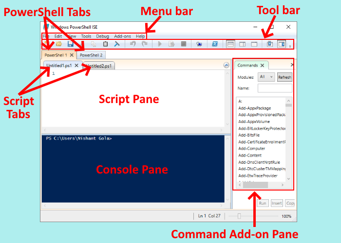 名前が示すように、PowerShell ISE のメニュー バーは、ファイル、編集、ツール、表示、デバッグ、アドオン、ヘルプなどのさまざまなメニューで構成されています。これらのメニュー ボタンを使用すると、さまざまなタスクの実行、ISE インターフェイスのカスタマイズ、コマンドやスクリプトのデバッグなどを行うことができます。