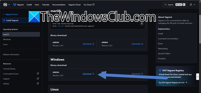 - Vagrant 公式 Web サイト (開発者.ハシコープ.com)、Windows 用 Vagrant インストーラーをダウンロードします。