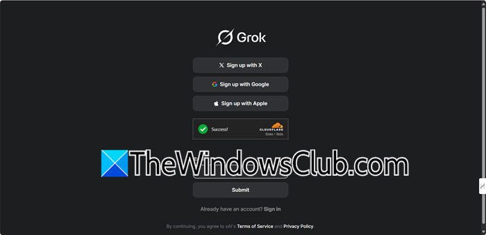 まず最初に、Grok Studio アカウントを作成する必要があります。無料または有料のアカウントの種類に関係なく、次のオプションがあることに注意してください。Googleスタジオで。サインアップするには、grok.com にアクセスして、サインアップ。これで、X (旧称 Twitter)、Google、または Apple アカウントにログインするか、新しいアカウントを作成できます。
