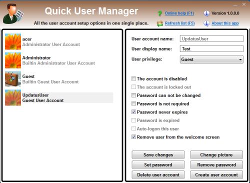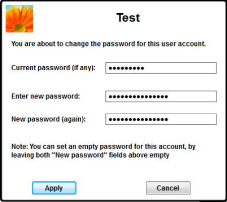 クイック ユーザー マネージャーを使用すると、ユーザー アカウントを管理するためのパスワードを簡単に変更できます。 「パスワードの設定」ボタンを押すと、現在のパスワードと新しいパスワードを入力してパスワードを変更できるボックスが表示されます。このアプリケーションでは、新しい既存のアカウントを作成または削除することもできます。