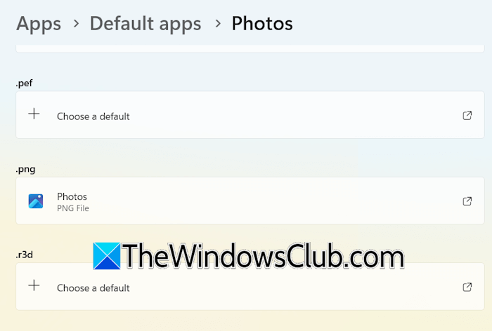 - 次に、ファイル名拡張子のリストを下にスクロールし、PNG、JPG などの一般的な画像ファイル名拡張子の写真アプリを選択します。