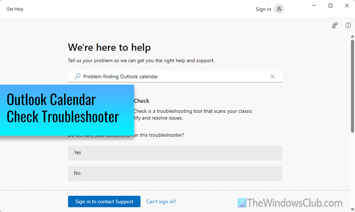Outlook 予定表が見つからない場合、または Outlook 予定表で問題が発生した場合は、Outlook 予定表チェックのトラブルシューティング ツールWindows 11/10 コンピューター上のカレンダーの問題を解決するには。このトラブルシューティング ツールは、Windows 11/10 に組み込まれているトラブルシューティング ツールである [ヘルプ] アプリを介して機能します。