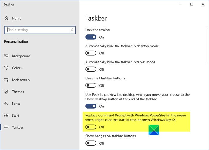- ここでスイッチをオンの位置に切り替えます –左下隅を右クリックするか、Windows キー + X を押すと、メニューのコマンド プロンプトが Windows PowerShell に置き換えられます。。