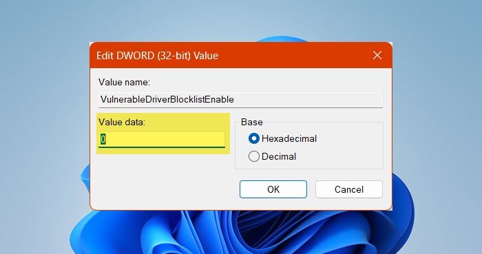 - 新しく作成したキーに名前を付けますVulnerableDriverBlocklistEnable。