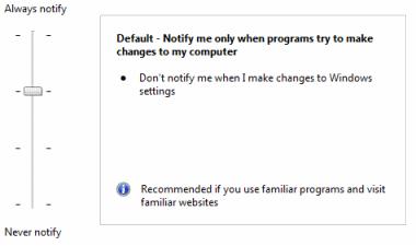 - Windows UAC 設定には、さまざまな通知レベルを変更するためのスライダーがあります