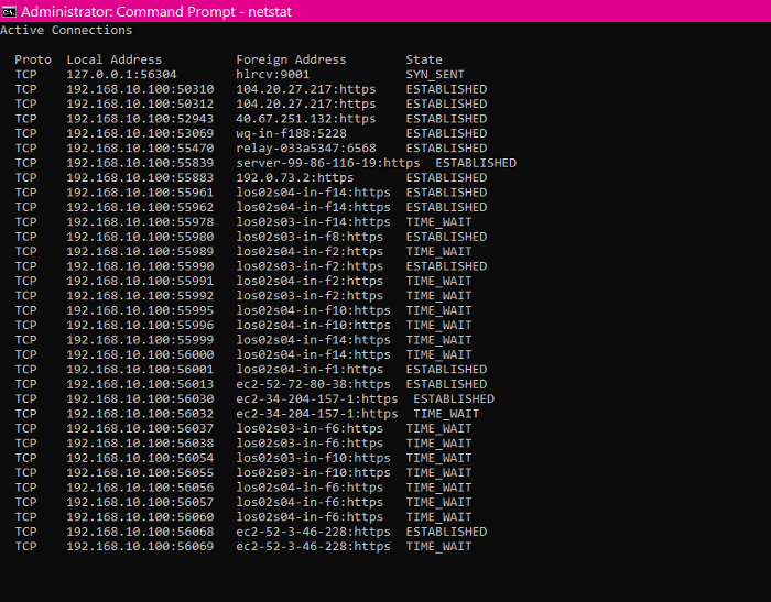 ポート番号や名前を表示したくない場合は、次の netstat パラメータを使用すると、外部アドレスの完全修飾ドメイン名が表示されます。