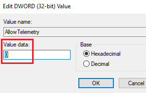 新しい値に名前を付けますテレメトリを許可する。値データが次のようになっている必要があることを確認します。0。