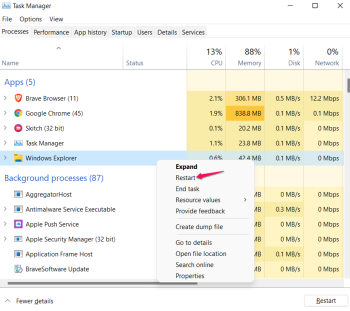 - 下にスクロールして Windows エクスプローラーを見つけます。それを右クリックして選択します再起動。