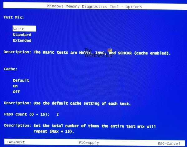 ほとんどのユーザーにとって、メモリ診断ツールを自動的に実行することをお勧めします。ただし、上級ユーザーはツールの設定を調整する必要がある場合があります。メモリ診断ツールが起動したら、F1 キーを押します。