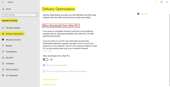 また、。このオプションをオンにすると、提供されたオプションで選択した内容に応じて、PC は以前にダウンロードした Windows アップデートとアプリの一部をローカル ネットワーク上の PC またはインターネット上の PC に送信することもあります。