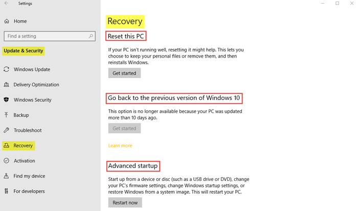 このタブには、PC に問題が発生した場合に備えて Windows を再インストールするオプションがあります。 10 日以内であれば、PC の Windows 10 の前のバージョンに戻すこともできます。高度なスタートアップシステム イメージから Windows を復元したり、Windows スタートアップ設定を変更したりすることができます。