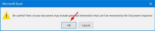 - Kai pamatysite iššokantį pranešimą „Būkite atsargūs! Kai kuriose dokumento dalyse gali būti asmeninės informacijos, kurios dokumentų inspektorius negali pašalinti“, spustelėkiteGerai.