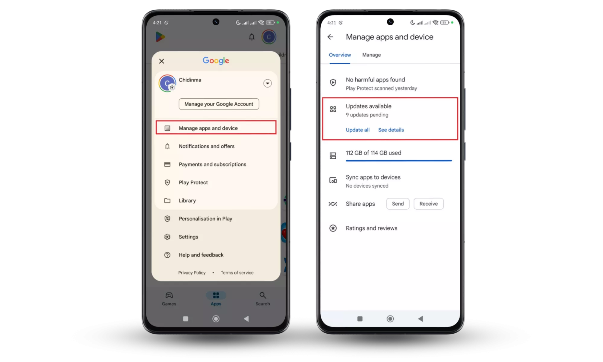1–4 veiksmai: atidarykite „Play Store“ > bakstelėkite profilio piktogramą > pasirinkite Tvarkyti programas ir įrenginį > Palieskite Atnaujinti viską.2. Nespauskite nuorodos el. laiške