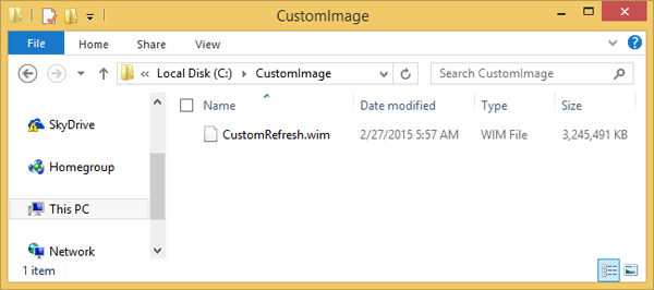 - Vaizdo kūrimas gali užtrukti mažiausiai 30 minučių ar ilgiau, atsižvelgiant į tai, kiek programų esate įdiegę. Kai tai bus padaryta, jūsų nurodytame aplanke pamatysite naują CustomRefresh.wim failą. Šis .wim failas bus nustatytas kaip numatytasis atnaujinimo vaizdas ir bus naudojamas kitą kartą, kai naudosite funkciją Atnaujinti kompiuterį.