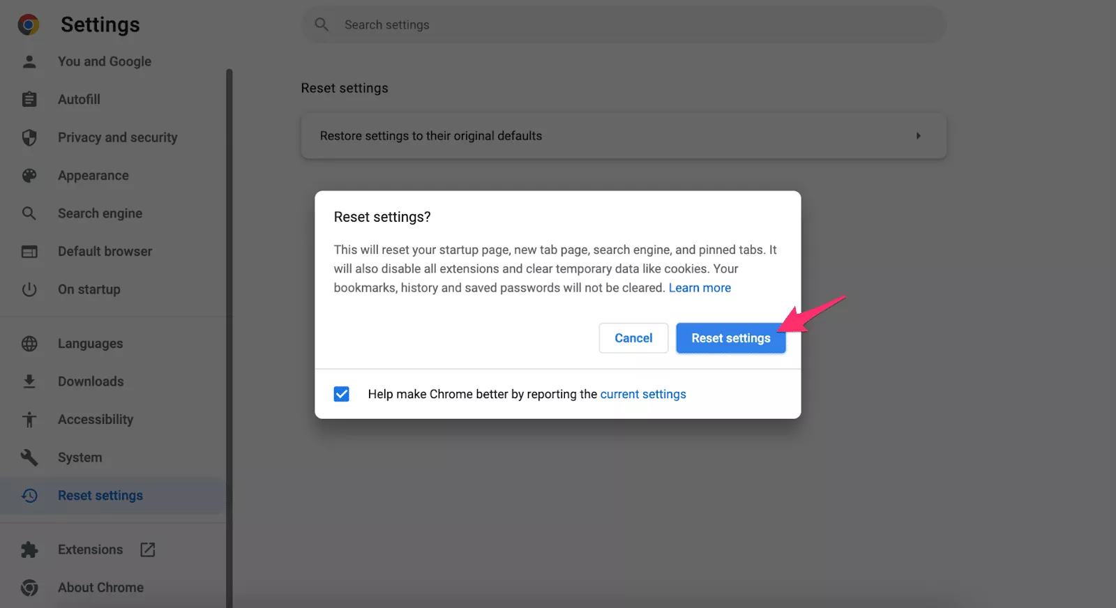 - RaskiteIš naujo nustatyti nustatymusskyrių