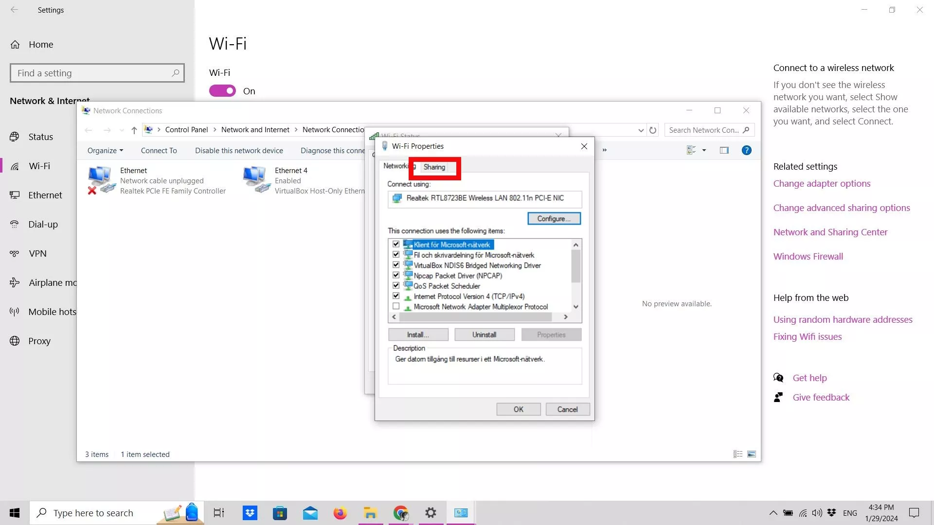5 veiksmas: „Wi-Fi“ ypatybėse eikite į skirtuką „Bendrinimas“.