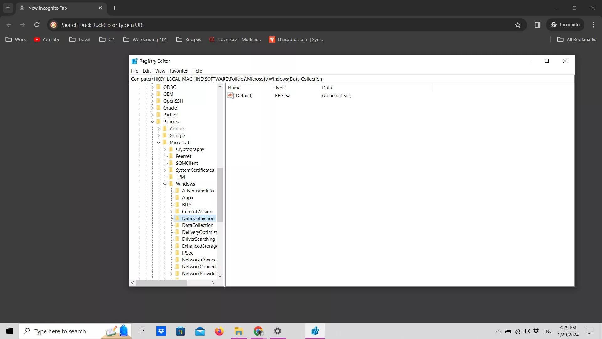 - Pavadinkite naują raktąDataCollection. Dešiniuoju pelės mygtuku spustelėkite dešinėje esančią sritį, sukurkite naująDWORD(32 bitų), ir pavadinkLeisti telemetriją.