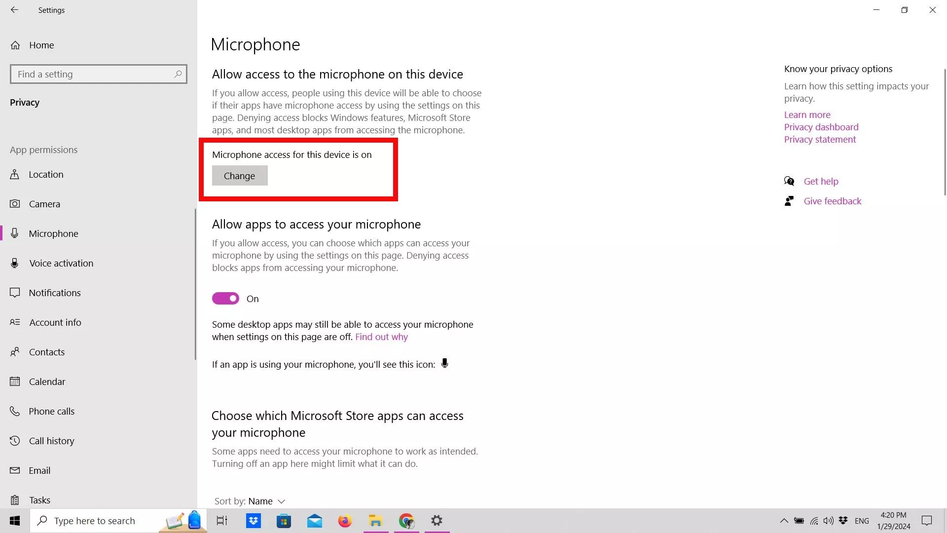 2 veiksmas: privatumo nustatymuose išjunkite mikrofonąAtminkite, kad, kaip ir fotoaparato atveju, mikrofono išjungimas reikš, kad mikrofonas neveiks jokioje programoje, įskaitant vaizdo skambučių. Galite jį įjungti prieš pradėdami vaizdo skambučius ir išjungti, kai baigsite – galbūt tai šiek tiek nepatogu, tačiau imtis papildomų veiksmų, kad apsaugotumėte savo privatumą, kartais gali būti nepatogu.