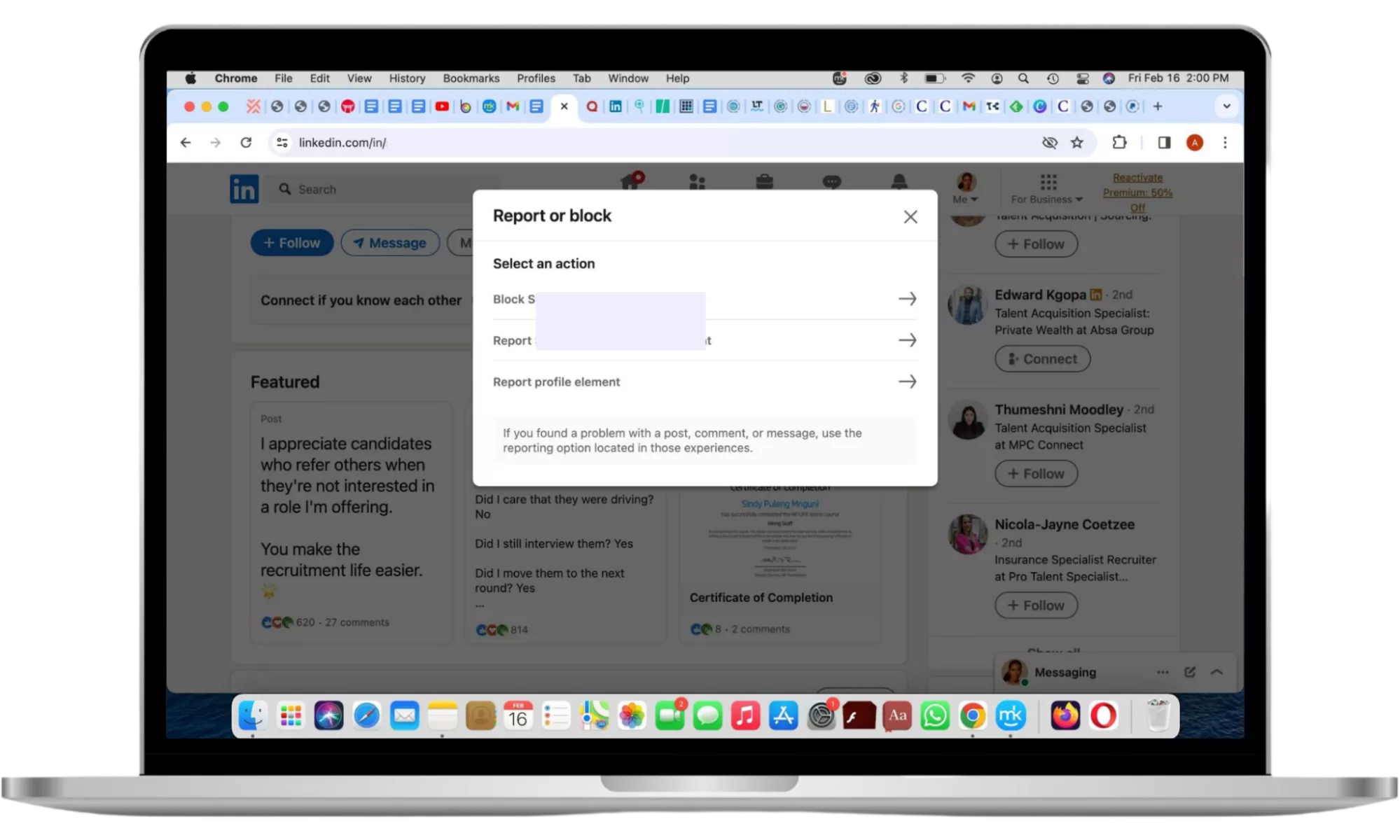- Užblokuokite jų profilį, kad išvengtumėte jūsųbuvęs nuo tavęs persekiojimo.Norėdami tai padaryti, eikite į jų „LinkedIn“ profilį ir spustelėkiteDaugiau > Pranešti / Blokuoti > Blokuoti [vardas] > Blokuoti.