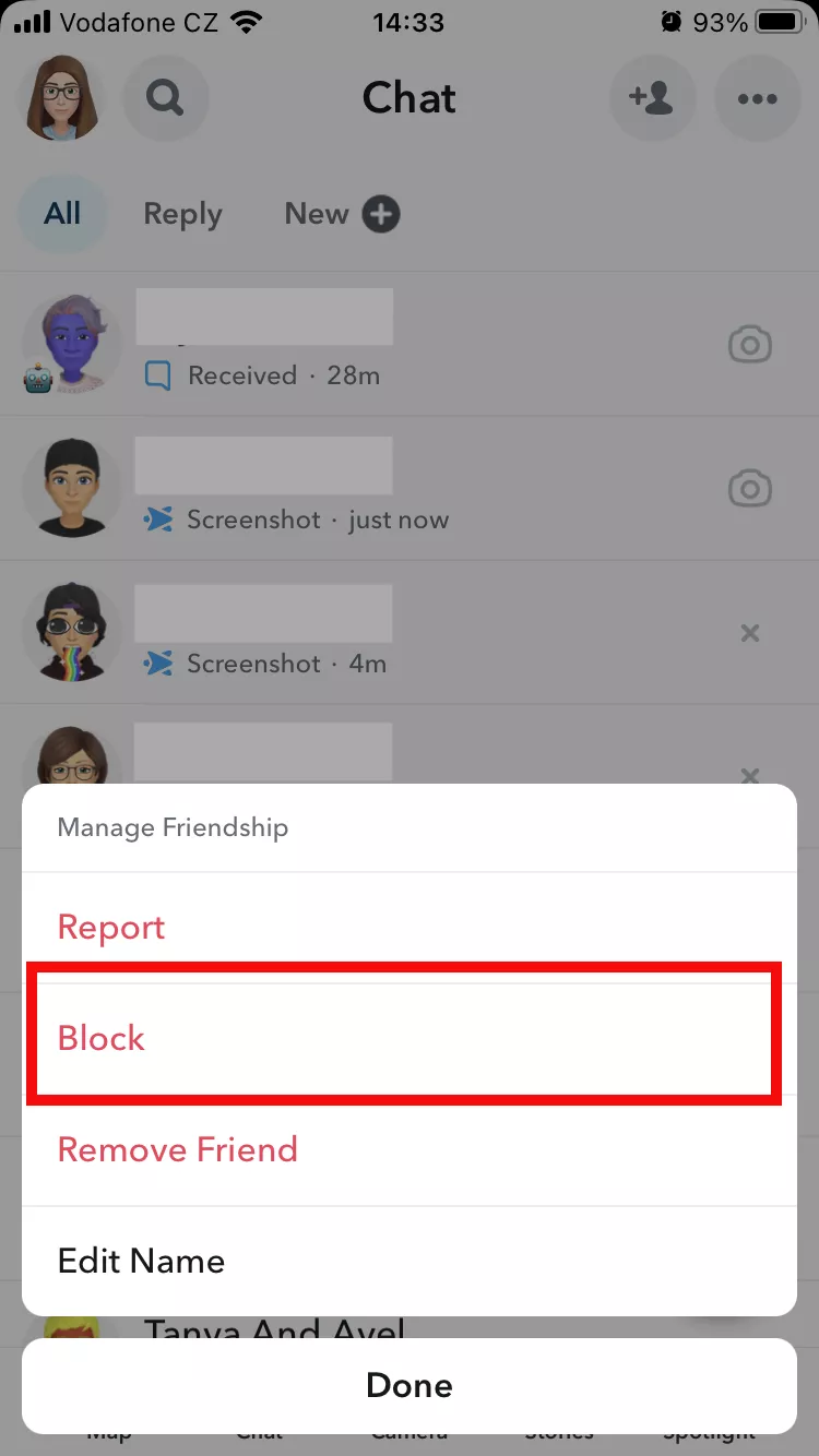 4 veiksmas: Tvarkyti draugystę pasirinkite Blokuoti, kad užblokuotumėte savo buv.Privatumo valdikliuose galite keisti, kas gali su jumis susisiekti „Snapchat“ ir kas gali peržiūrėti jūsų istoriją.