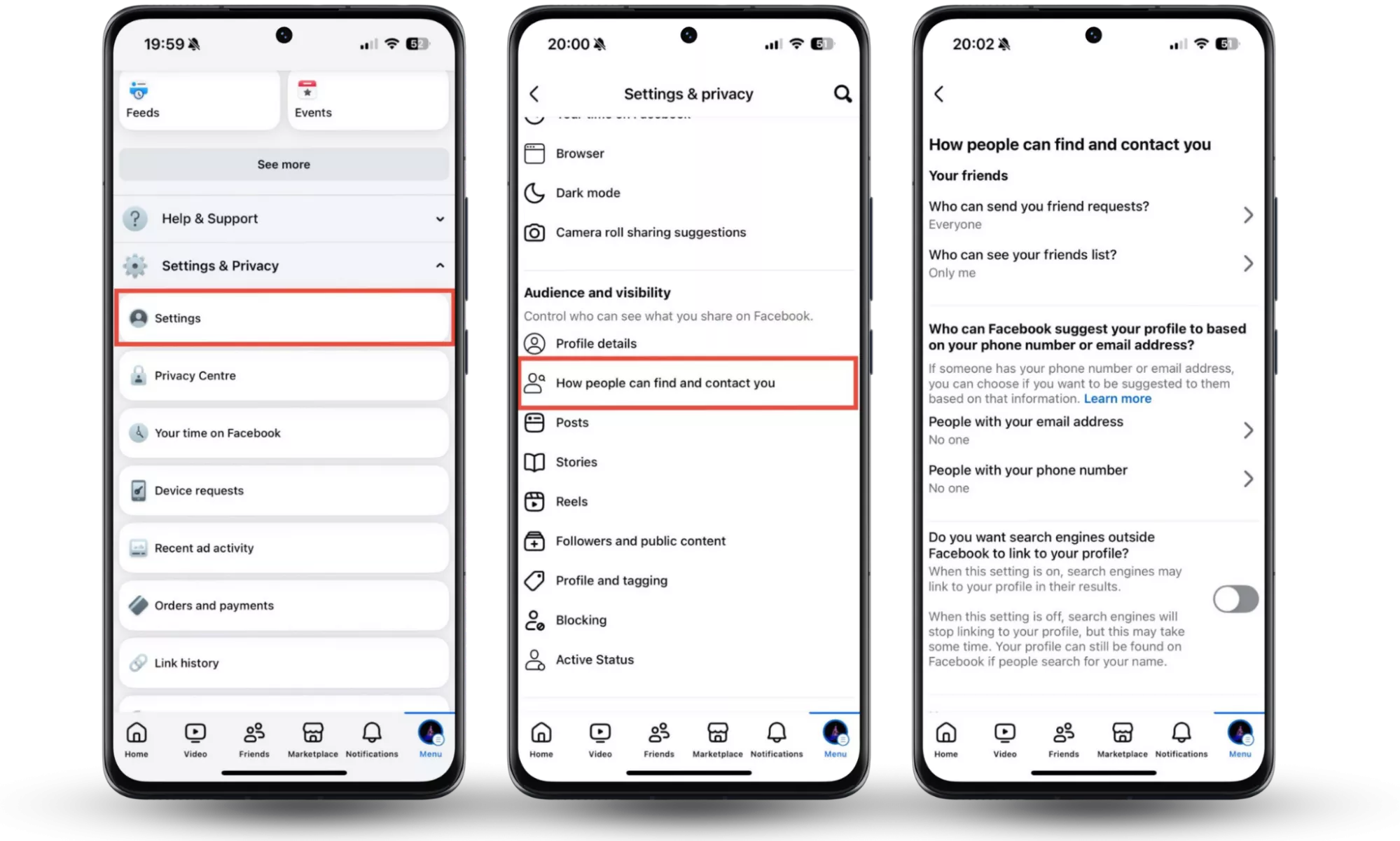 1–3 veiksmai: meniu > Nustatymai ir privatumas > Nustatymai > Kaip žmonės gali jus rasti ir susisiekti > pasirinkite parinktisTaip pat galite atlikti kitus veiksmus, kad pagerintumėte „Facebook“ privatumą, pavyzdžiui: