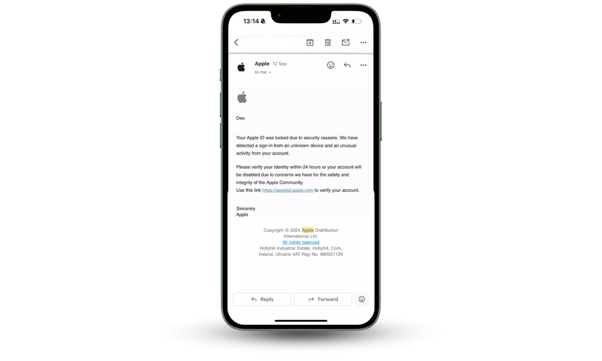 Netikri Apple el. laiškai, taip pat žinomi kaip sukčiavimo el. laiškai, imituoja oficialius Apple ryšius, kad apgautų jus atskleisti asmeninę informaciją. Laiškuose bus nuorodų į apgaulingus prisijungimo puslapius, raginančius įvesti Apple ID ir slaptažodį. Juose taip pat gali būti kenkėjiškų priedų, kurie įdiegia kenkėjiškas programas jūsų įrenginyje. Norėdami to išvengti, visada patikrinkite siuntėjo adresą ir būkite atsargūs dėl skubių ar įtartinų užklausų.