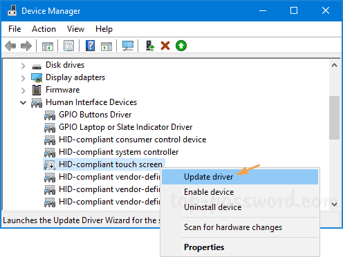 - Dabar turime atnaujinti jutiklinio ekrano tvarkyklę. Tiesiog dešiniuoju pelės mygtuku spustelėkiteHID skundų jutiklinis ekranasir tada pasirinkite "Atnaujinti tvarkyklę“.