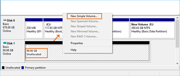4.Greitai galite gauti nepaskirstytos vietos kiekį. Dešiniuoju pelės mygtuku spustelėkite nepaskirstytą vietą ir pasirinkiteNaujas paprastas tomasvariantas.