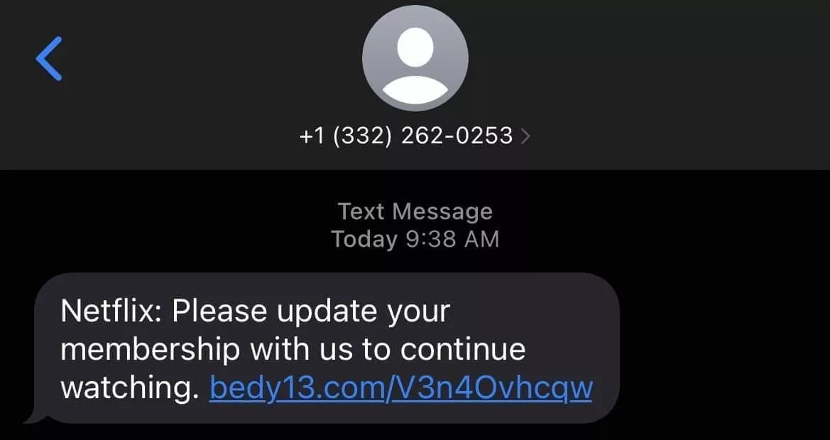 Šiame pranešime sukčius bando priversti auką sekti nuorodą į jų kenkėjišką svetainę. Įtartina nuoroda su ne „Netflix“ URL yra tiesioginė raudona vėliavėlė. Be to, telefono numerio paieška internete rodo, kad jis neturi nuorodos į teisėtą „Netflix“ įmonę.