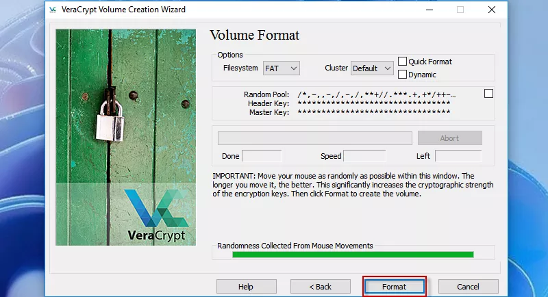 8 veiksmas: perkelkite pelę atsitiktine tvarka pagalSVARBUpatarimai ir spustelėkiteFormatas.Galiausiai pastebėsite, kad VeraCrypt tomas buvo sėkmingai sukurtas.