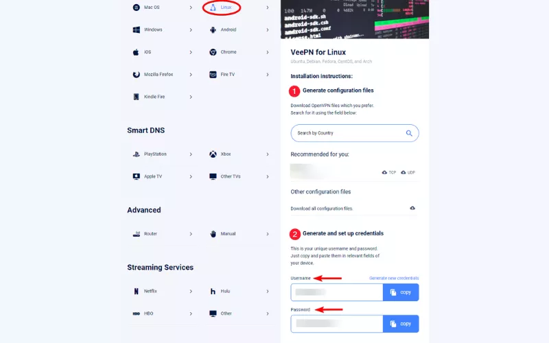 - Prisijunkite prie savo VeePN paskyros ir skiltyje Nustatyti naujus įrenginius pasirinkite Linux.