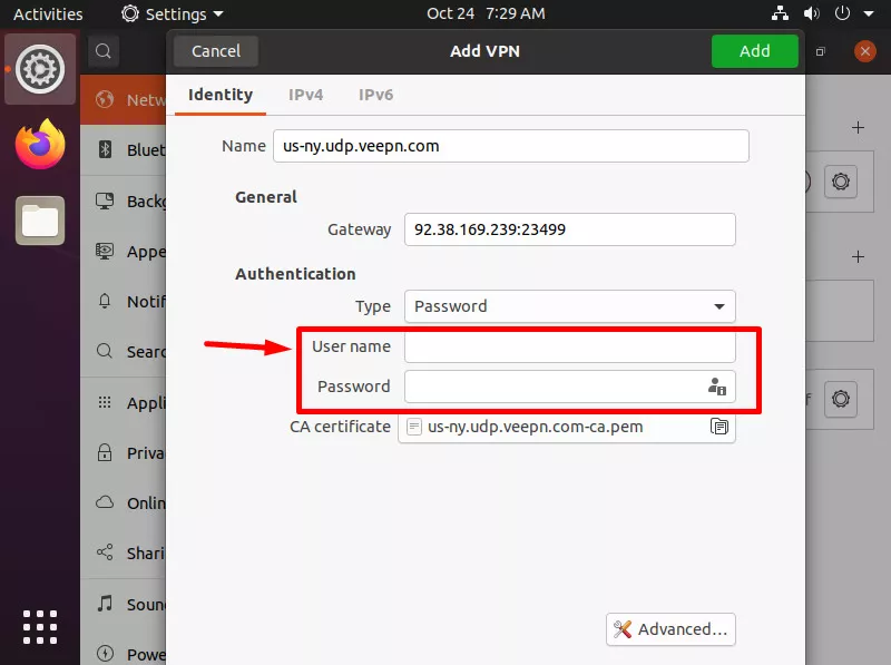 - Pateikite naudotojo vardą ir slaptažodį, sugeneruotus 2 veiksme, ir spustelėkite Pridėti. Uždarykite nustatymų langą.