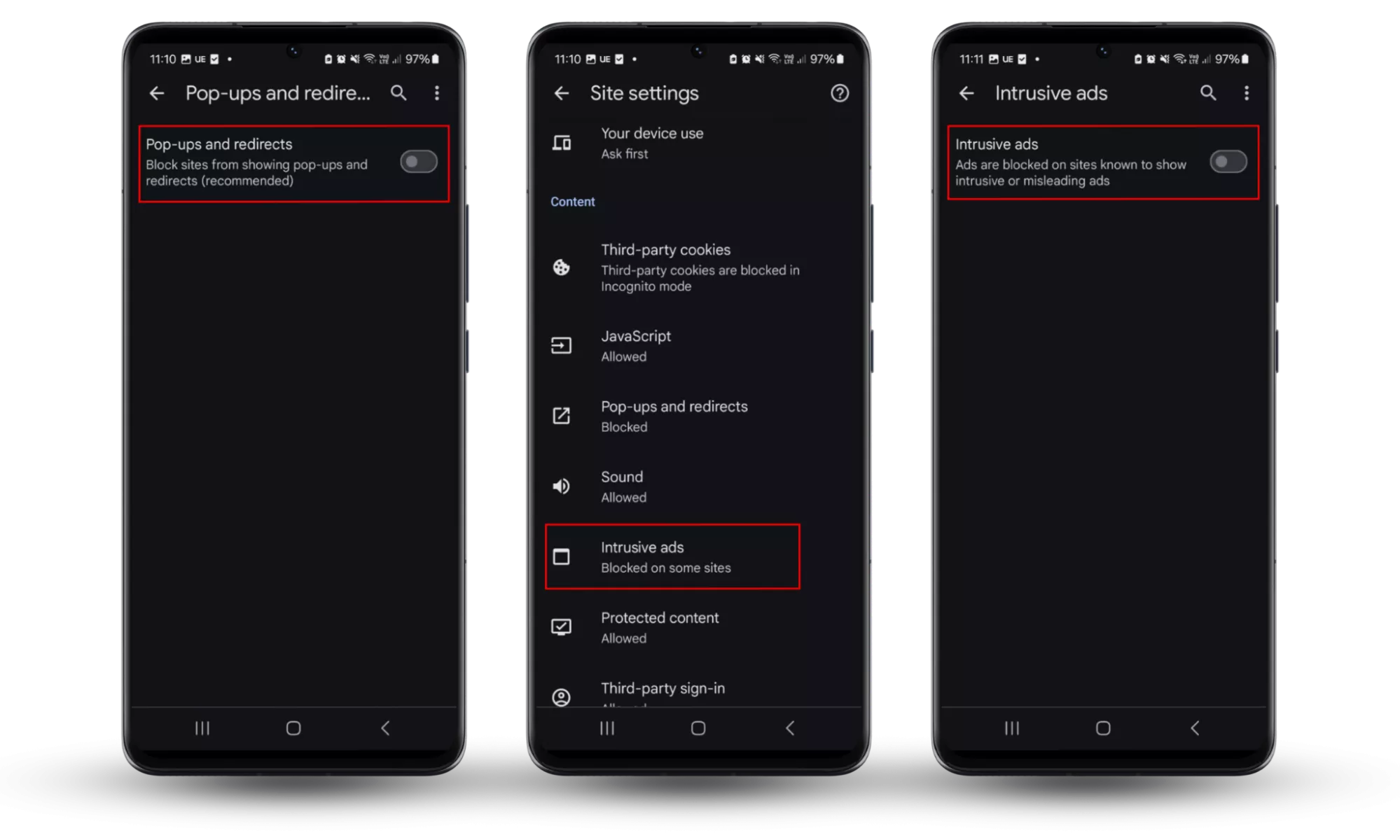 4–5 veiksmai: išjunkite iššokančiuosius skelbimus, tada grįžkite į svetainės nustatymus ir išjunkite įkyrius skelbimus.Kaip pašalinti iššokančius virusus, kuriuos sukelia kenkėjiškos programos „Android“.
