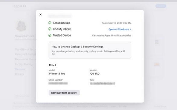 3 veiksmas.Iššokančiajame ekrane spustelėkitePašalintiir tai atjungs pasirinktą įrenginį nuo Apple ID.