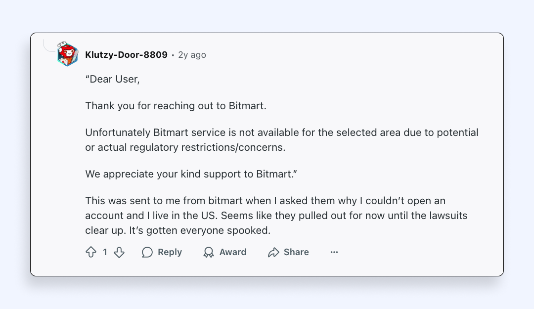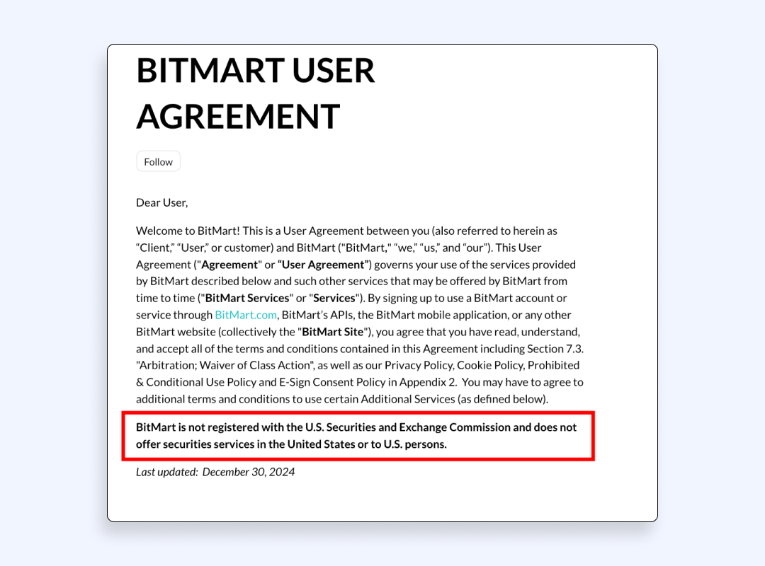 Nors BitMart birža yra registruota MSB, ji vis tiek yraneregistruotassu JAV vertybinių popierių ir biržų komisija (SEC). Taigi, užuot rizikavęs teisiniais veiksmais ar brangiomis vykdymo bylomis, „BitMart“ galbūt nusprendė blokuoti prieigą savo klientams JAV ir išvengti teisinių rūpesčių.