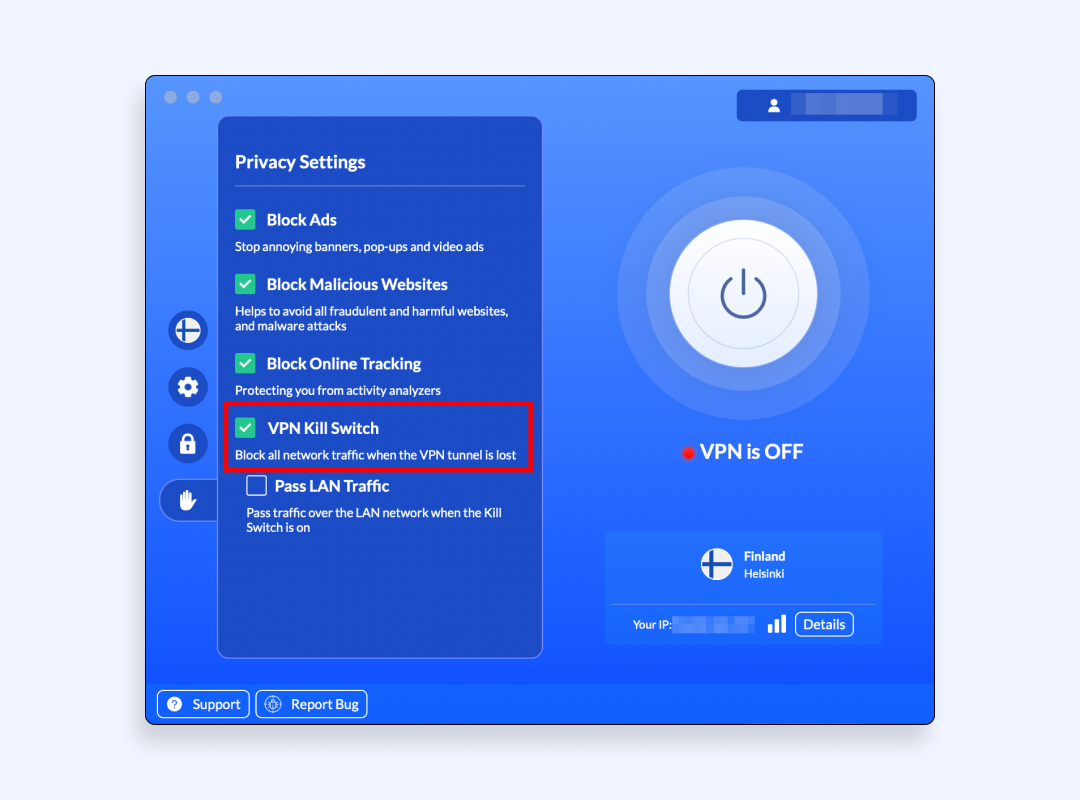 4. Eikite į „VeePN“ privatumo nustatymus ir įjunkite „Kill Switch“ funkciją. Šis nustatymas neleidžia nutekėti tikrojo IP adreso, jei „Wi-Fi“ ryšys nutrūksta net sekundei. Tai būtinas apsauginis tinklas, jei prekiaujate kriptovaliuta iš JAV.