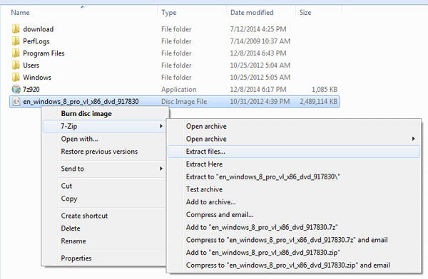 - Dabar turime nukopijuoti sąrankos failus iš „Windows 8 ISO“ į standųjį diską. Tai galima padaryti naudojant nemokamą programinę įrangą7-Zip. Įdiegę 7-Zip vietoje, dešiniuoju pelės mygtuku spustelėkite savo Windows 8 ISO atvaizdą ir pasirinkite7-Zip->Išskleiskite failus.
