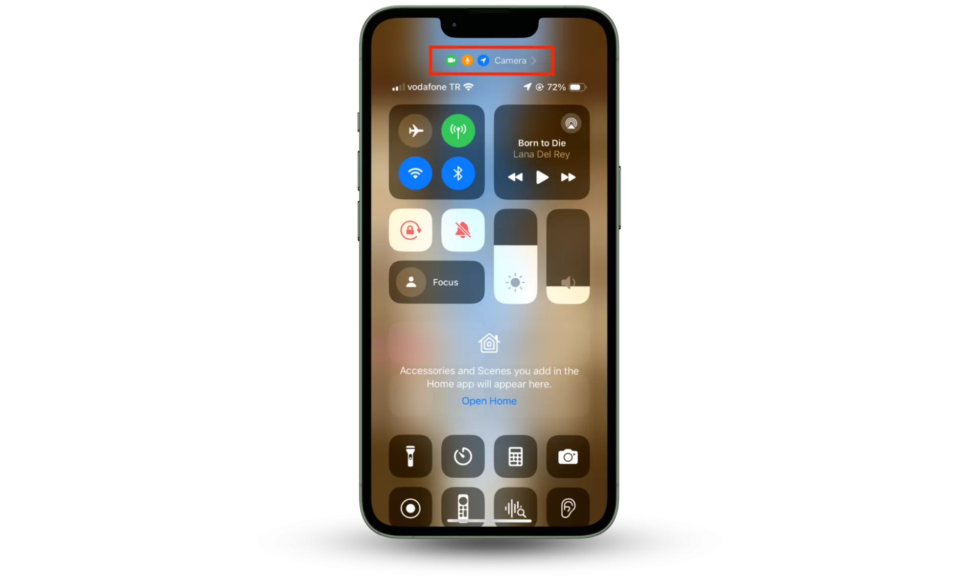 „iPhone“ viršuje rodomas žalias taškas rodo, kad jūsų telefono kamera yra naudojama.Tai taip pat gali reikšti, kad mikrofonas įjungiamas tuo pačiu metu kaip ir kamera. Jūsų fotoaparato programa gali būti atidaryta arba veikia fone – galbūt pamiršote ją uždaryti.