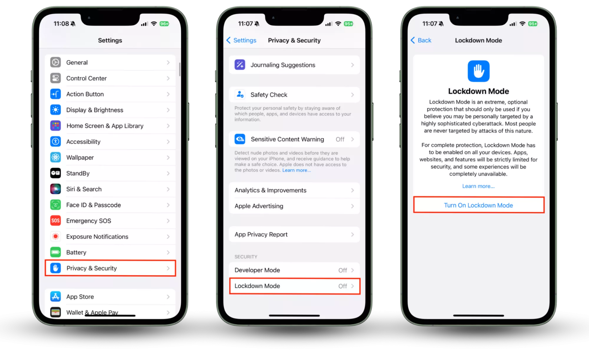 1-4 veiksmas: Privatumas ir sauga bakstelėkite Užrakinimo režimas > Įjungti užrakinimo režimą.Kai jūsų iPhone paleidžiamas iš naujo, bus aktyvus užrakinimo režimas. Kaip paaiškina „Apple“, „Lockdown Mode“ yra ypatinga apsauga, daugiausia skirta asmenims, kuriems kyla sudėtingiausių kibernetinio saugumo grėsmių dėl to, kas jie yra ar ką daro.