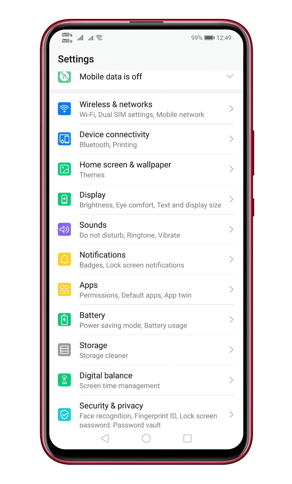 - PaleiskiteNustatymaiprograma „Android“ telefone.