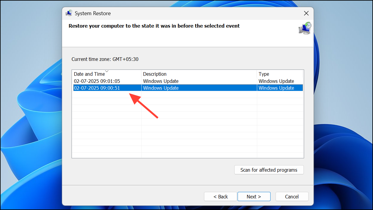 3 veiksmas:SpustelėkiteScan for affected programskad pamatytumėte, kas pasikeis, tada tęskite atkūrimą. Sistema bus paleista iš naujo ir grįš į pasirinktą atkūrimo tašką, o tai gali išspręsti atkūrimo klaidą, jei ją sukėlė naujausi pakeitimai.