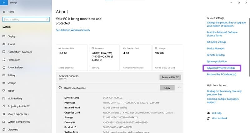 2 veiksmas.Pasirinkite „Apie“ ir ieškokite mėlynai pabraukto „Išplėstiniai sistemos nustatymai“. Tai bus dešinėje „Windows 10“ ir pagrindiniame „Windows 11“ ekrane.