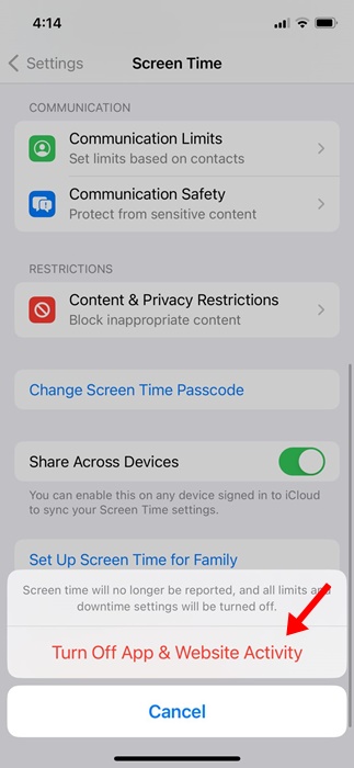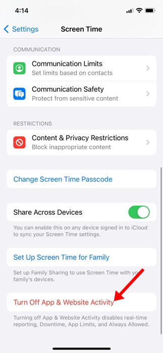 3. Slinkite žemyn iki apačios ir bakstelėkiteIšjunkite programų ir svetainių veiklą.
