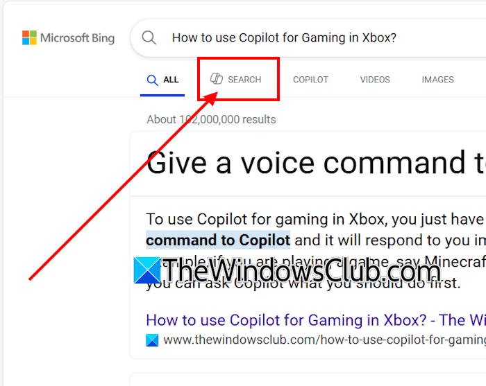 Norėdami naudoti „Copilot“ pagrįstą paiešką „Bing“, atidarykite „Microsoft Edge“ ir apsilankykite „Bing“ pagrindiniame puslapyje. Dabar įveskite paieškos užklausą ir paspauskiteĮeikite. Kai paspausite Enter, Bing parodys tradicinį paieškos rezultatų puslapį, kuriame matysite nuorodas į kai kurias svetaines ir vaizdo įrašus. Jei norite naudoti paiešką su Copilot, spustelėkitePAIEŠKAparinktis po paieškos juosta. Ši paieškos parinktis turi Copilot piktogramą.
